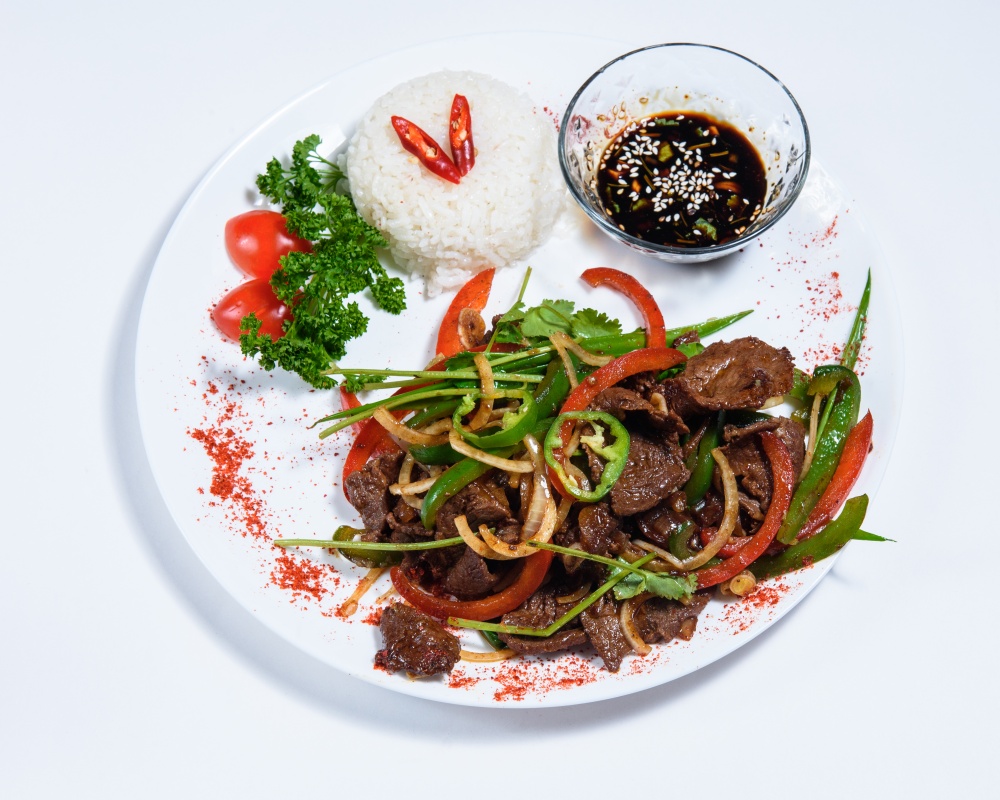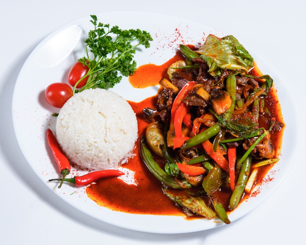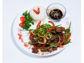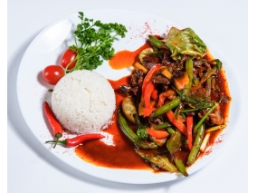 говядина, сладкий перец, стручковая фасоль, грибы, микс зелень, в остро-сладком соусе
