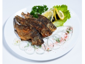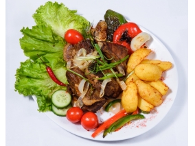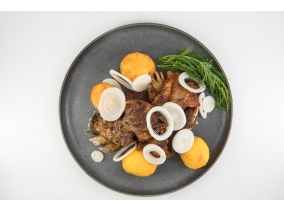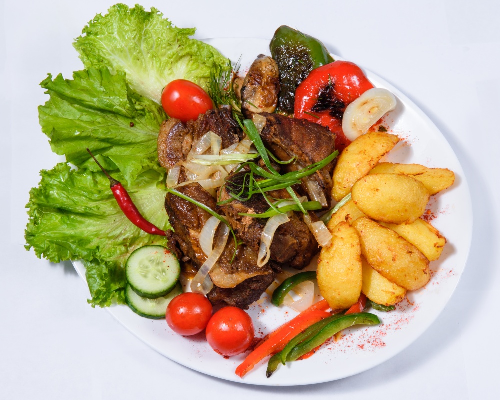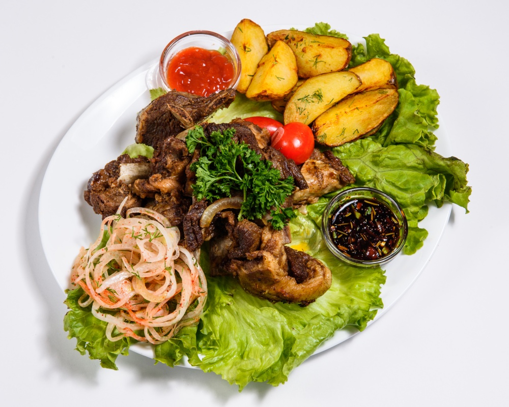 жареные бараньи ребрышки с луком, картофель на гарнир, зелень