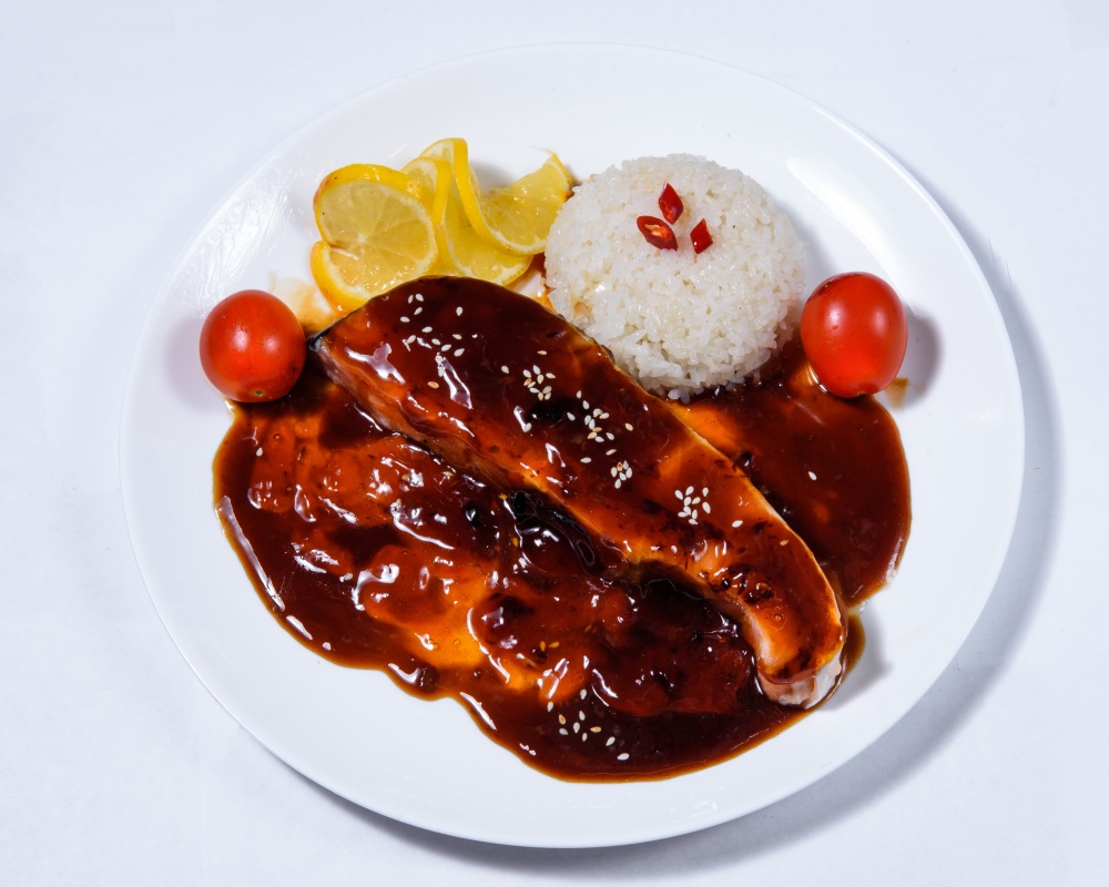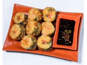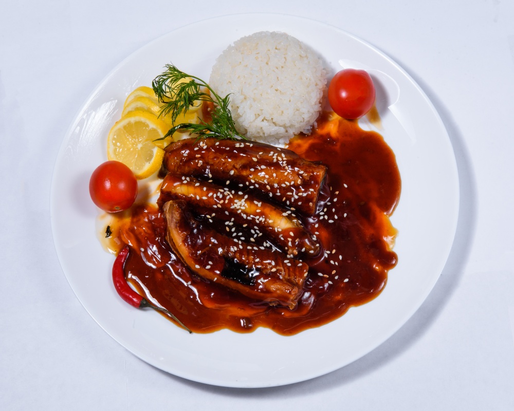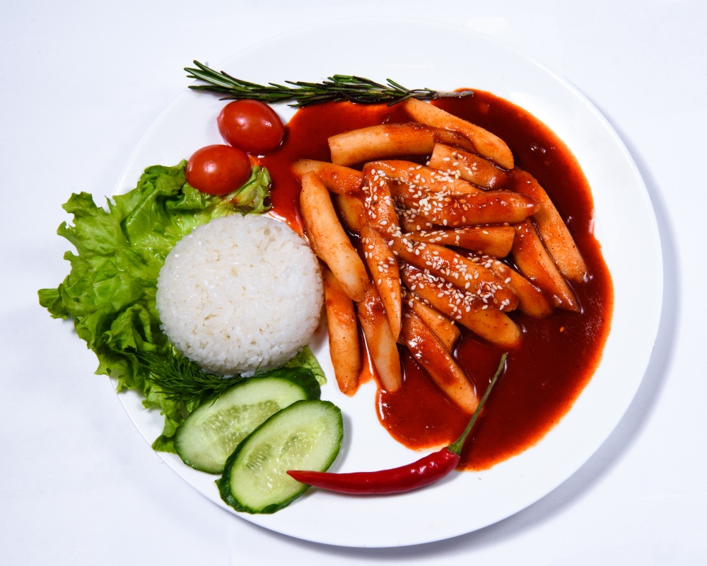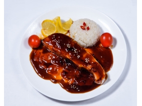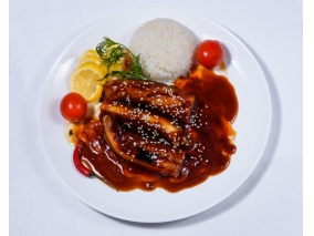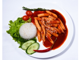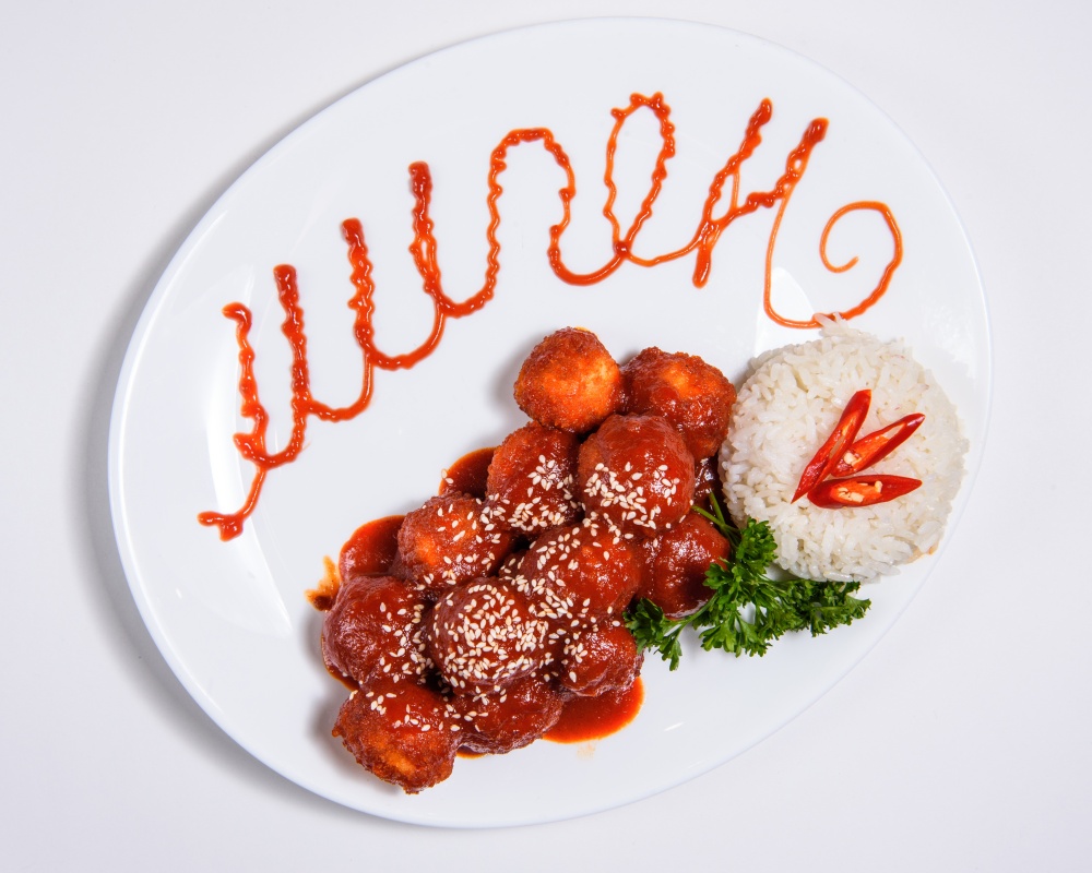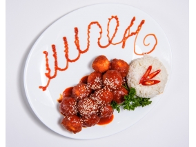 Шарики из куриного филе в остром соусе, на гарнир рис, кунжутные семечки