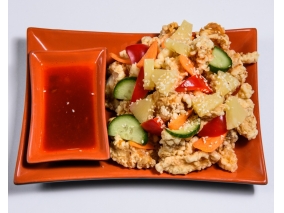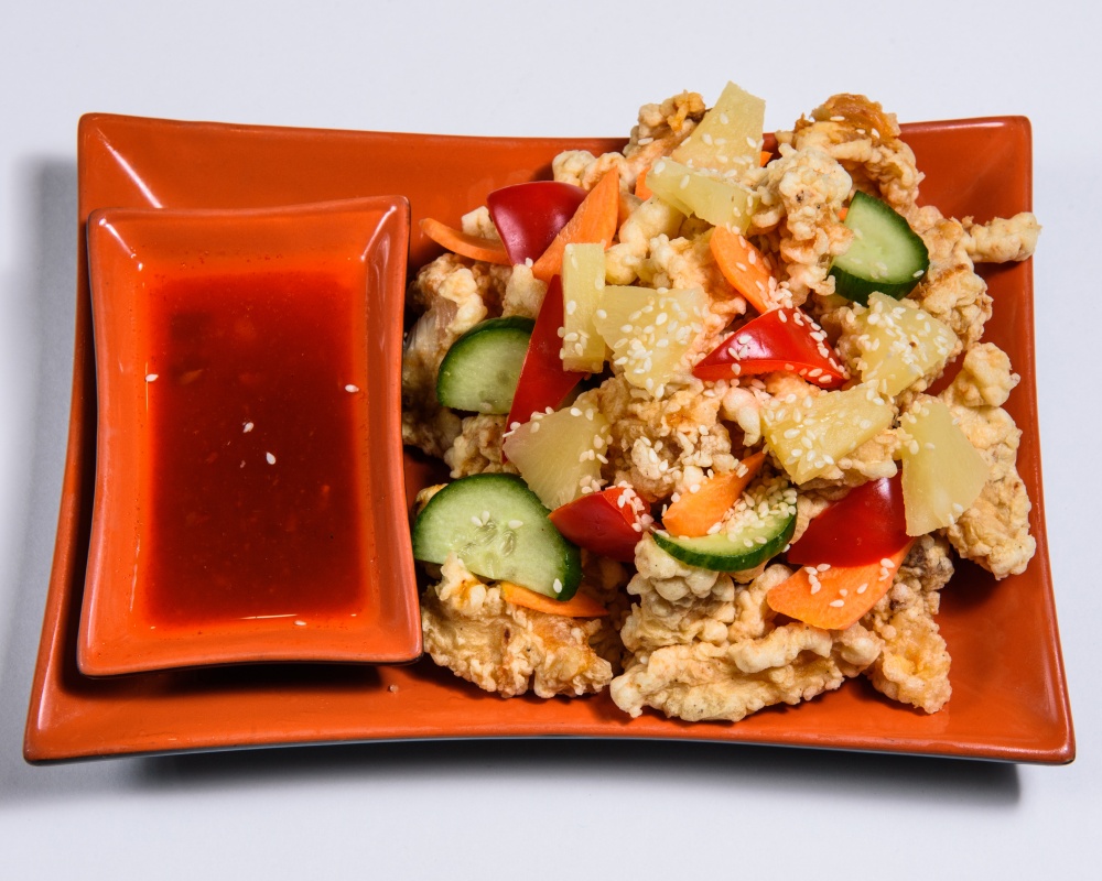 куриное филе жареное в кляре, свежие овощи, ананас маринованный , кунжутные семечки, острый соус