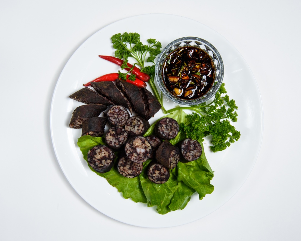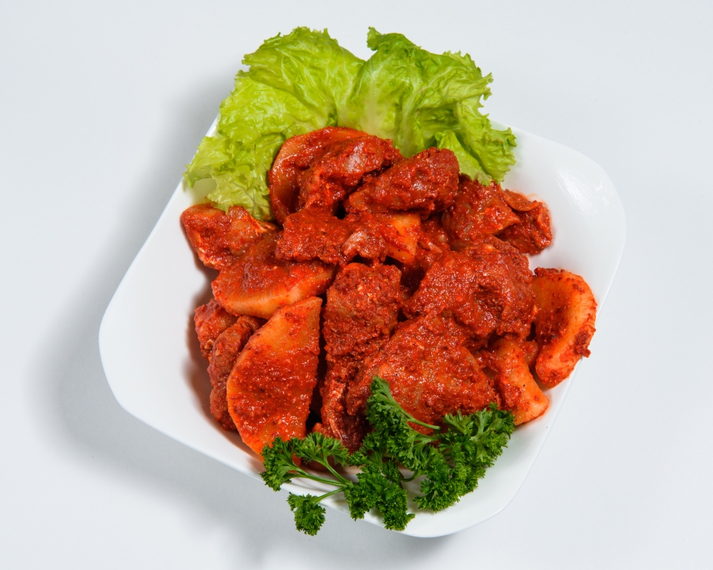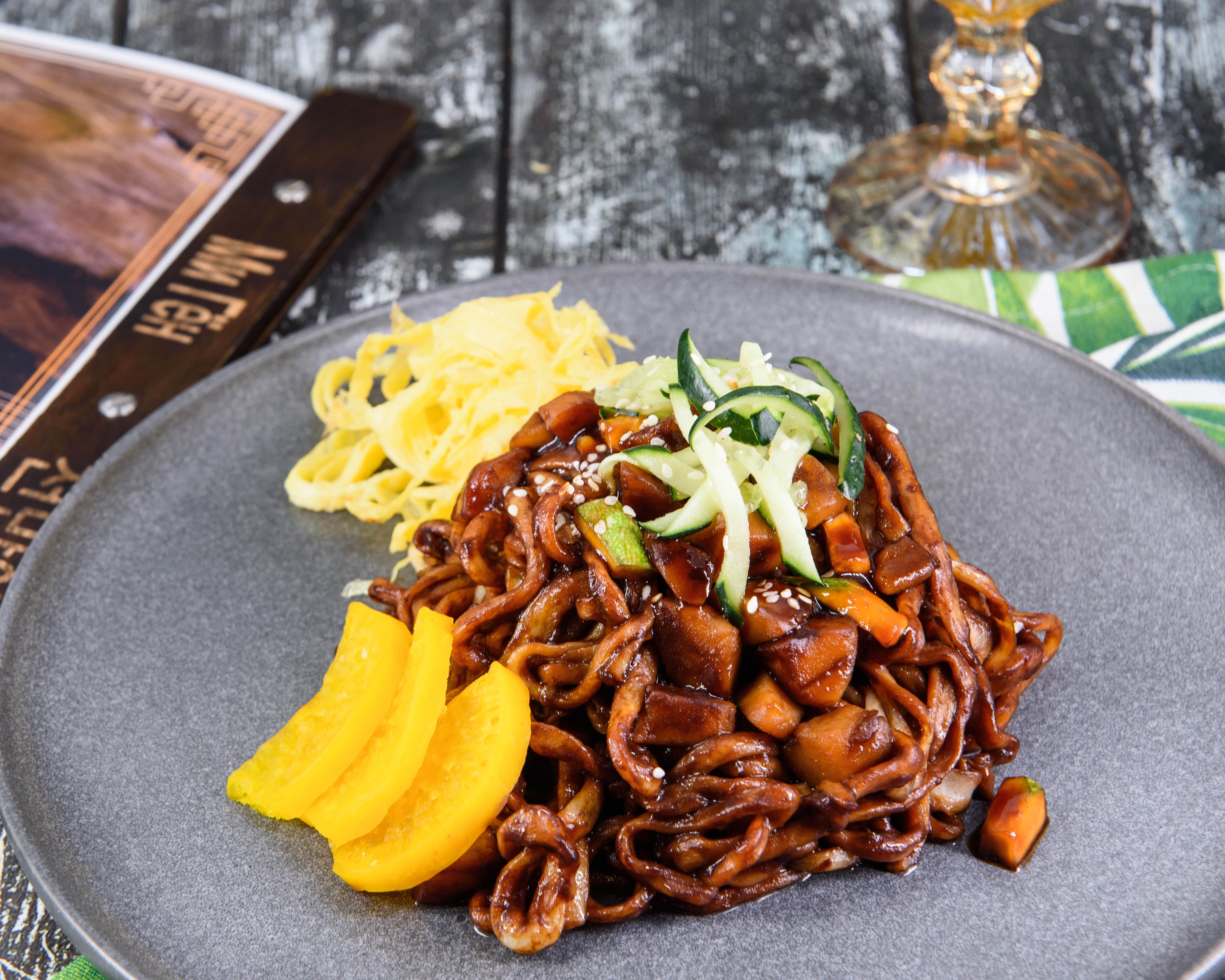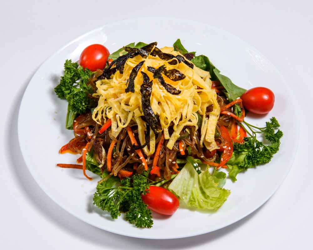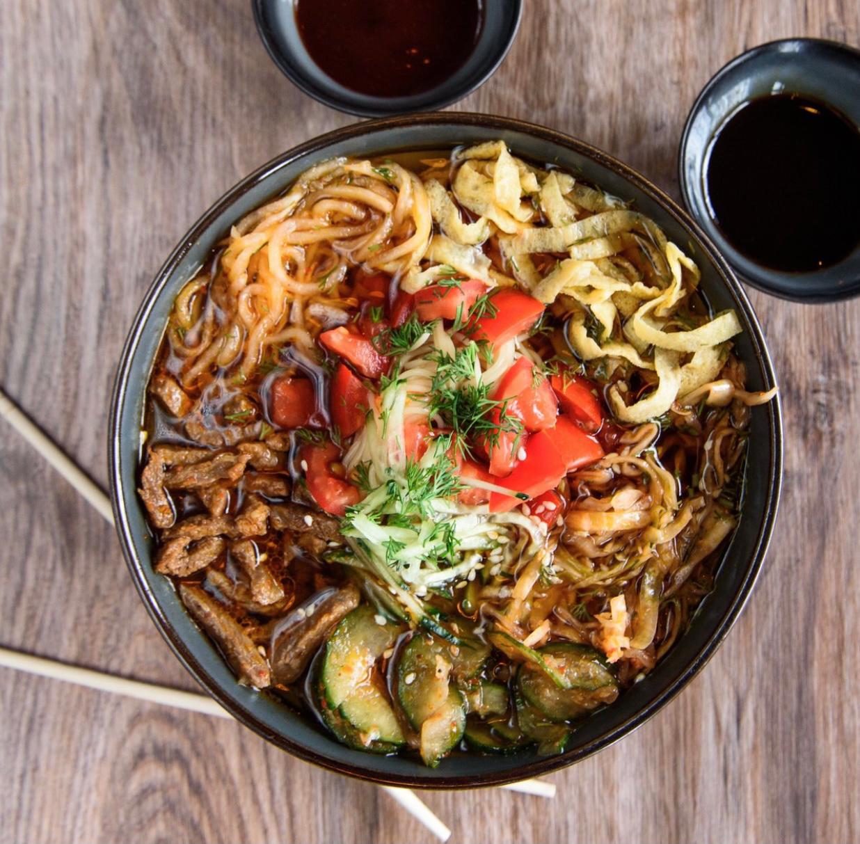 Лапша, яичные блины, помидоры, кунжутные семена, чуми - огурцы, дайкон, капуста, говядина. Подаётся в холодном/тёплом/горячем виде