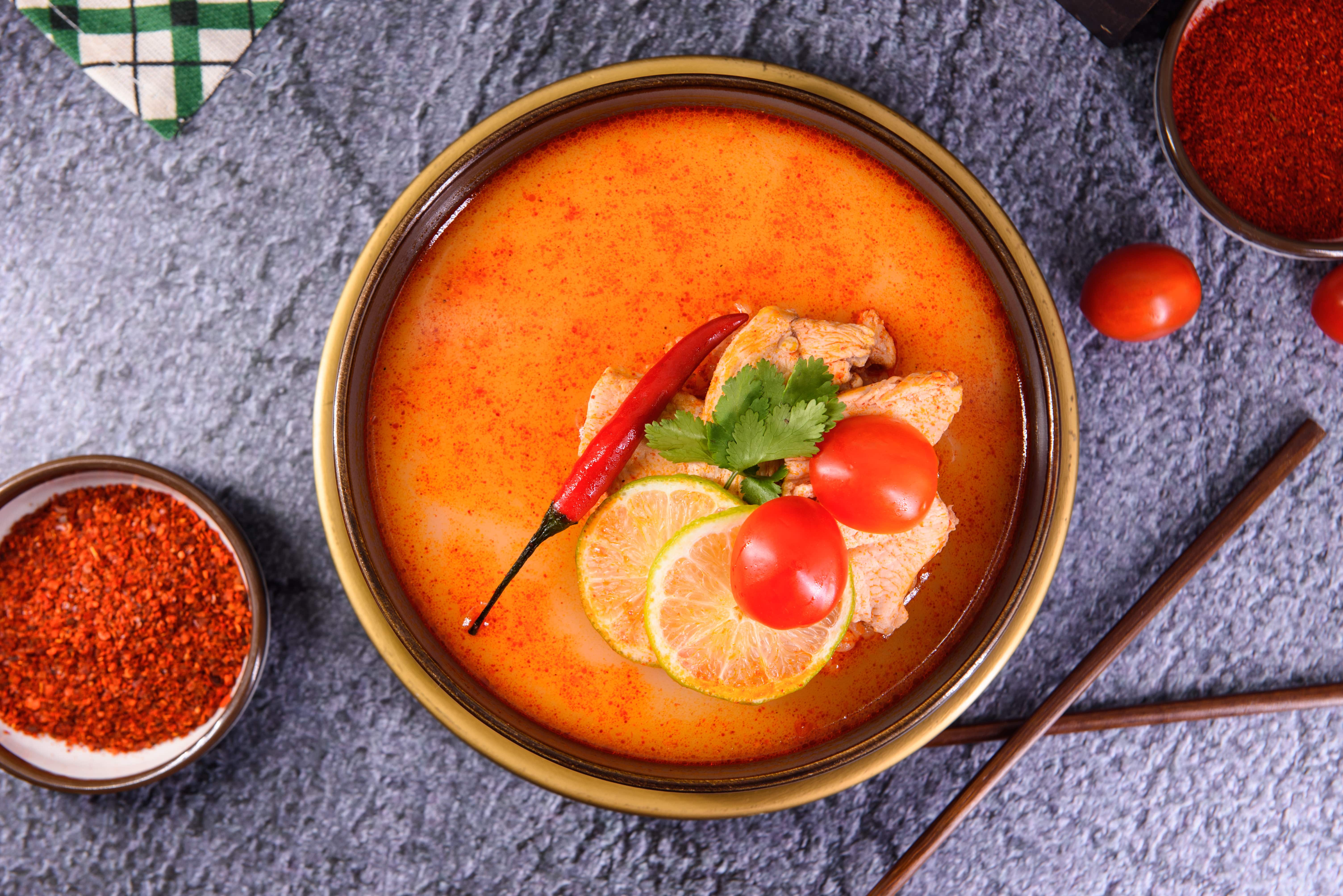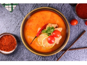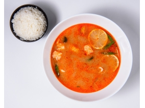 Острый тайский суп на кокосовом молоке, кусочки куриного филе, чили, томаты, лук, лайм