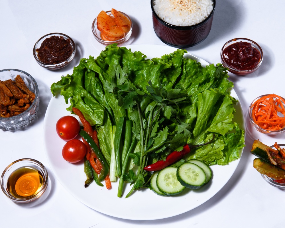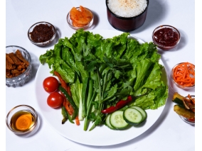 Корейский голубец из свежего лист салата, кусочки говядины , микс зелень, рис, перцовая паста, кунжутное масло , паста Твендян