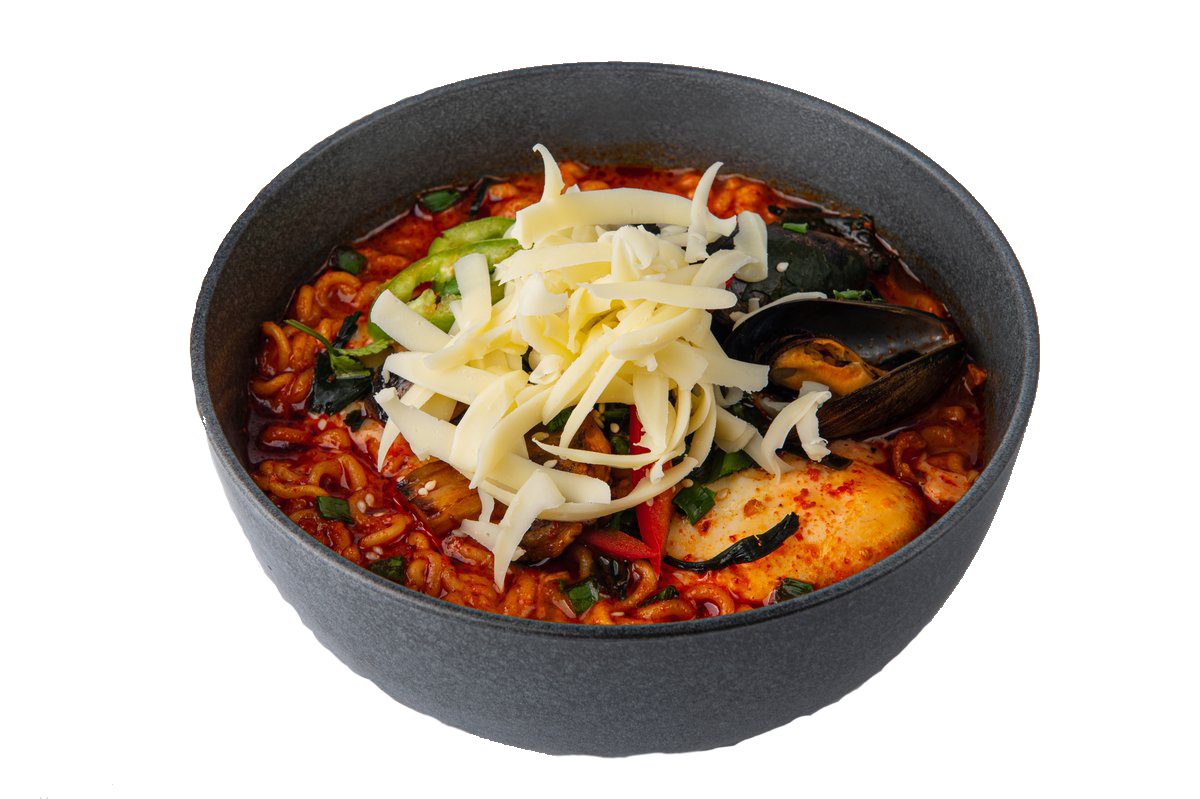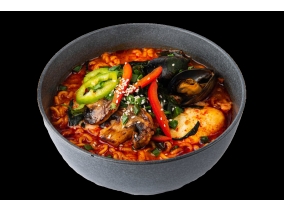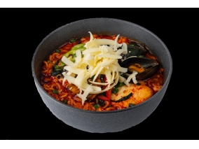 Морской коктейль, лапша рамён, грибы, мидии, яйцо, сыр моцарелла