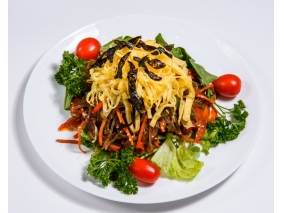 Крахмальная лапша, говядина, сладкий перец, микс зелень, яичные блины, кунжутное масло и семена