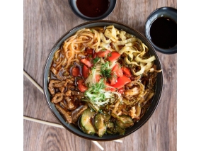 Лапша удон, сладкий бобовый соус, цукини, огурец, картофель, яичные блины, зеленый лук
